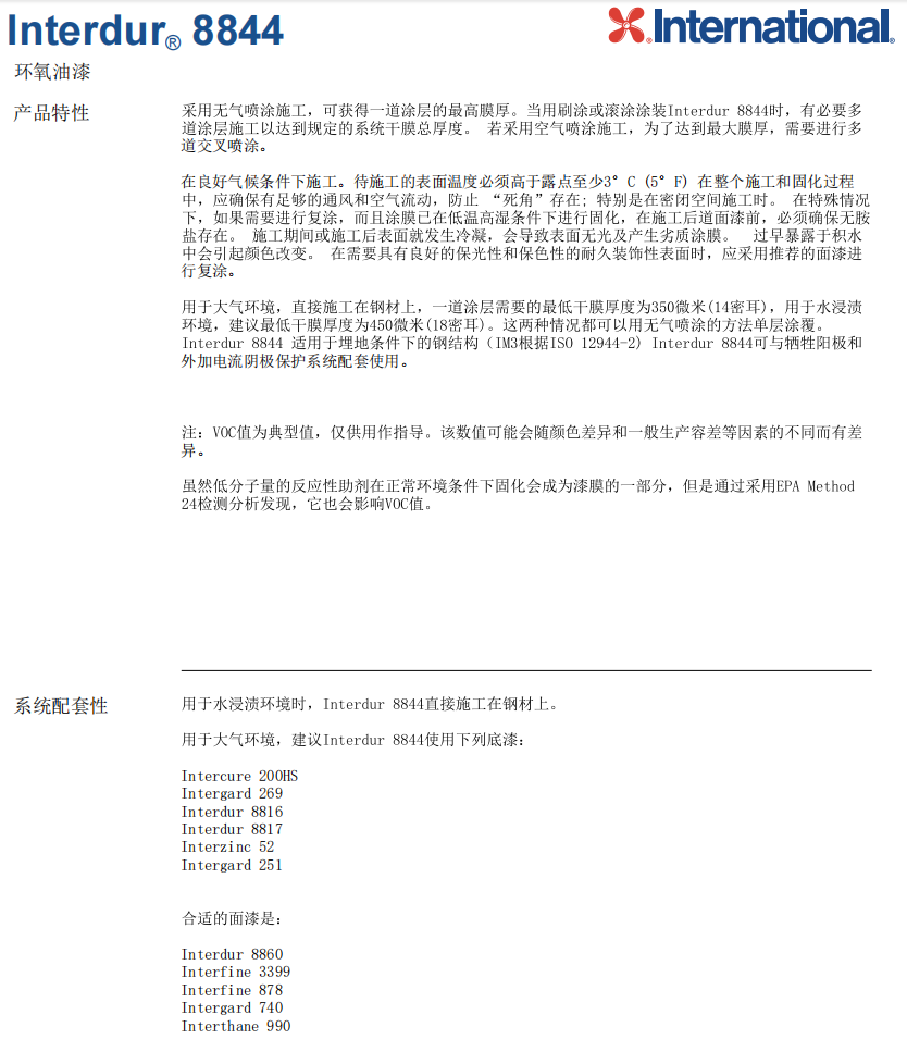 产品简介:Interdur8844防腐涂料;环氧油漆Interdur8844防腐涂料用于所有腐蚀环境中的钢结构保护,包括海上结构的飞溅区、甲板下和水上区域、桩结构、造纸厂、桥梁及化工厂。可为新建结构物和维修保养提供优异的长期耐腐蚀性。